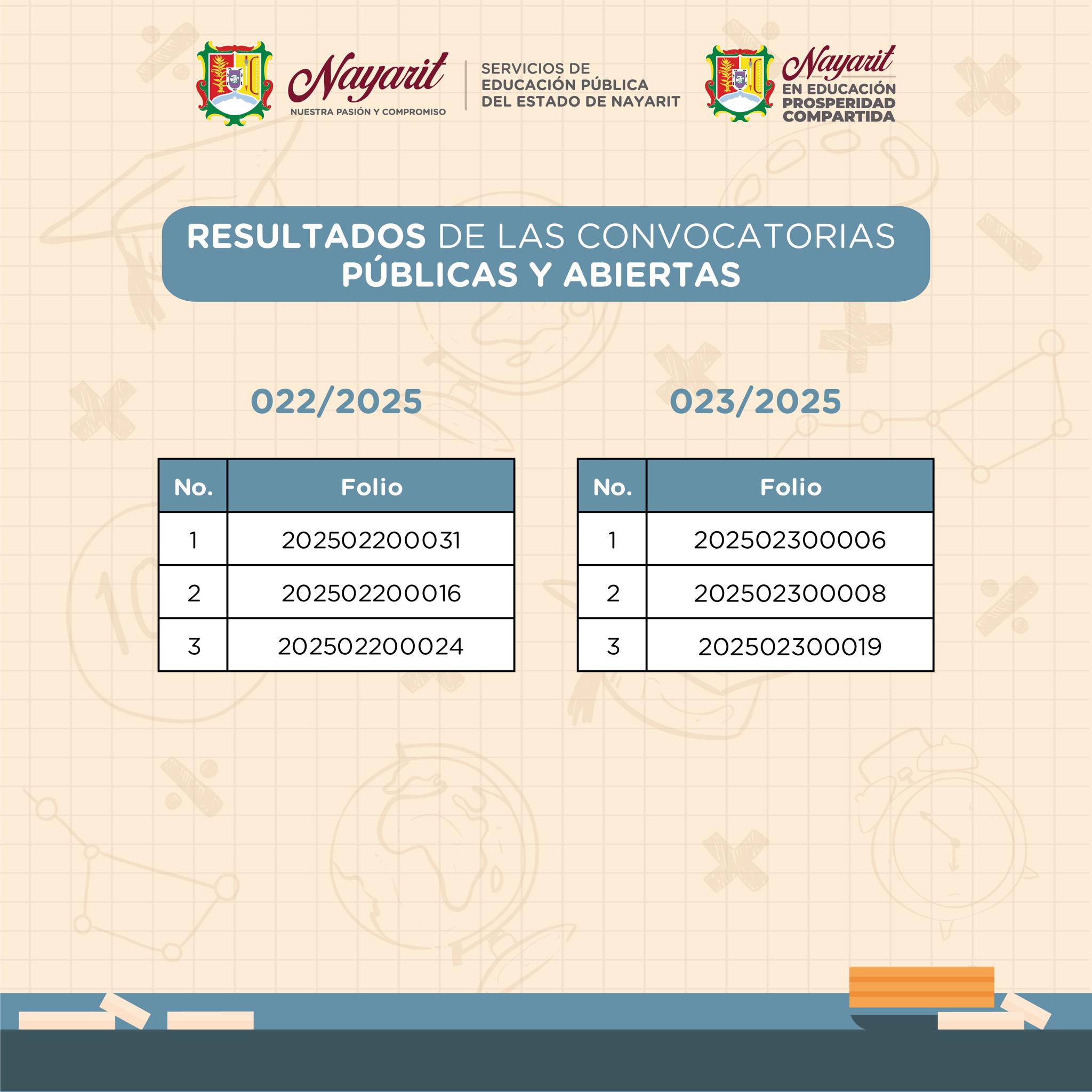 Los Servicios de Educación Pública del Estado de Nayarit, con fundamento en el artículo 39 fracción XII de la Ley General del Sistema para la Carrera de las Maestras y los Maestros, hacen públicos los resultados de las Convocatorias Públicas y Abiertas 022/2025 y 023/2025 para ocupar los puestos vacantes dentro de los centros de trabajo de Educación Indígena dependientes de estos Servicios de Educación Pública del Estado de Nayarit.