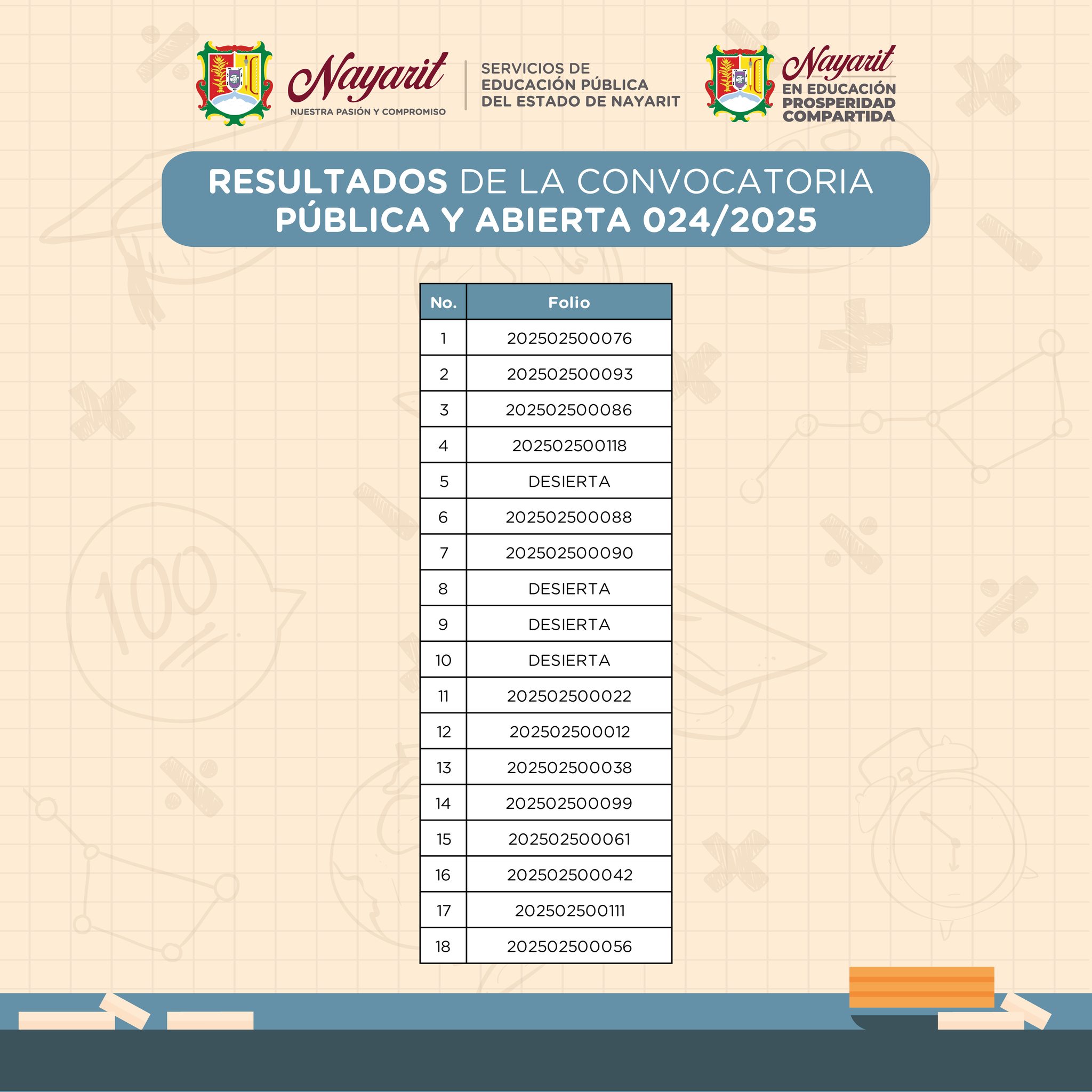 Los Servicios de Educación Pública del Estado de Nayarit, con fundamento en el artículo 39 fracción XII de la Ley General del Sistema para la Carrera de las Maestras y los Maestros hacen públicos los resultados de la convocatoria pública y abierta 024/2025 para ocupar los puestos vacantes dentro de los centros de trabajo de Educación Especial dependientes de estos Servicios de Educación Pública del Estado de Nayarit.