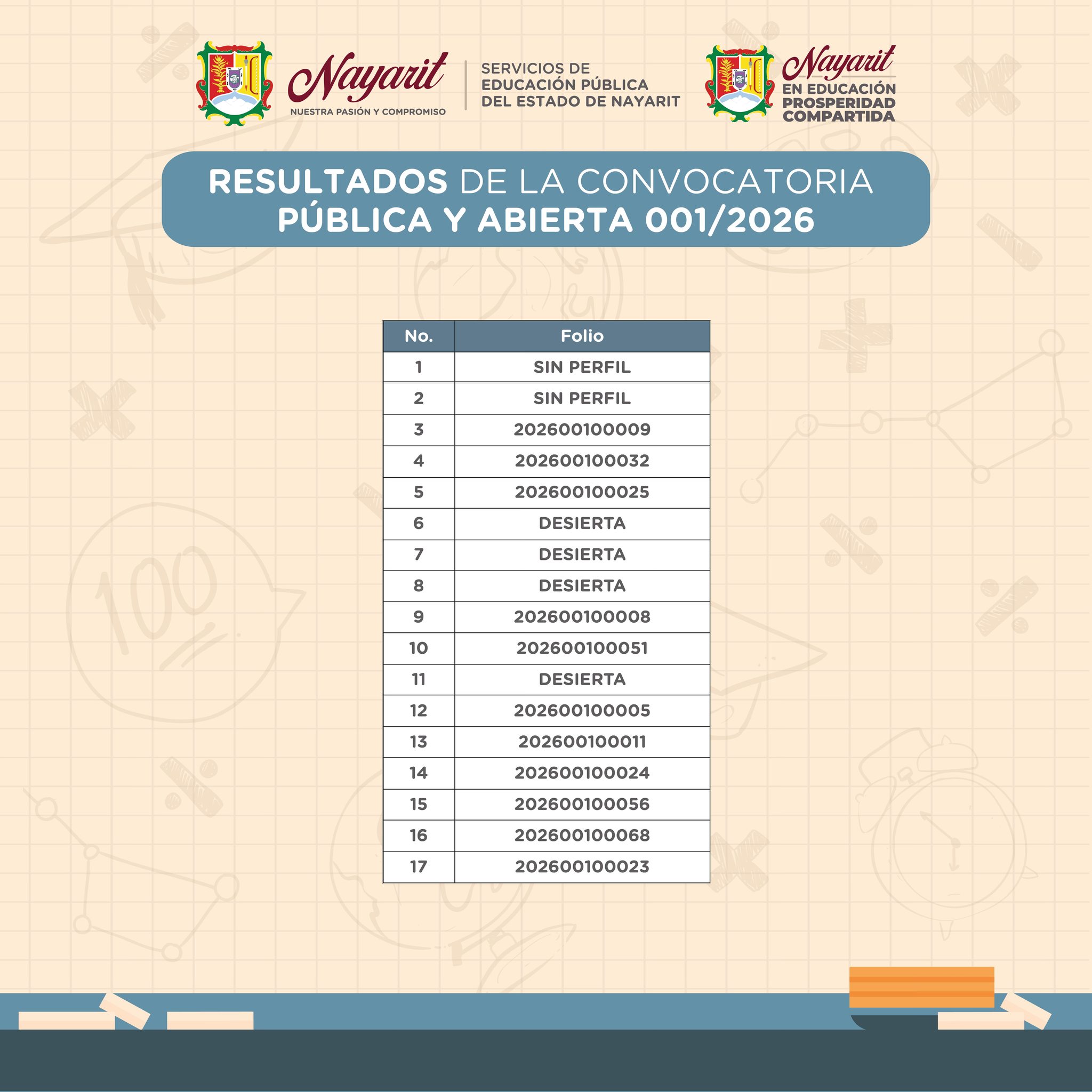Los Servicios de Educación Pública del Estado de Nayarit, con fundamento en el artículo 39 fracción XII de la Ley General del Sistema para la Carrera de las Maestras y los Maestros hacen públicos los resultados de la convocatoria pública y abierta 001/2026 para ocupar los puestos vacantes dentro de los centros de trabajo de Educación Secundaria dependientes de estos Servicios de Educación Pública del Estado de Nayarit.