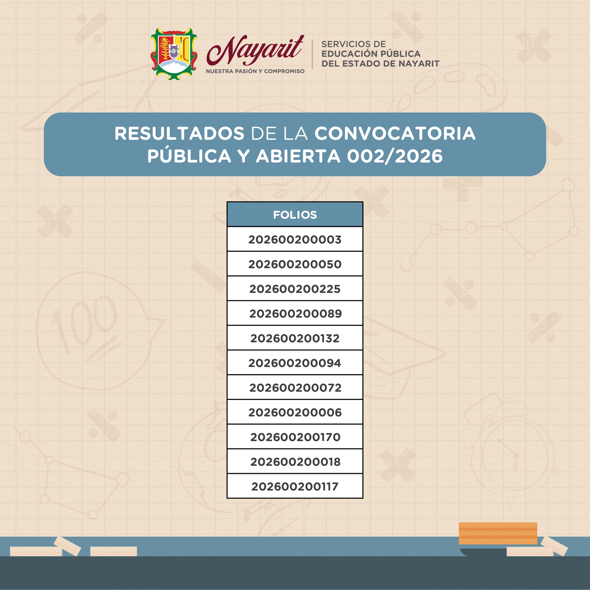 Los Servicios de Educación Pública del Estado de Nayarit, con fundamento en el artículo 39 fracción XII de la Ley General del Sistema para la Carrera de las Maestras y los Maestros hacen públicos los resultados de la convocatoria pública y abierta 002/2026 para ocupar los puestos vacantes dentro de los centros de trabajo de Educación Especial dependientes de estos Servicios de Educación Pública del Estado de Nayarit.