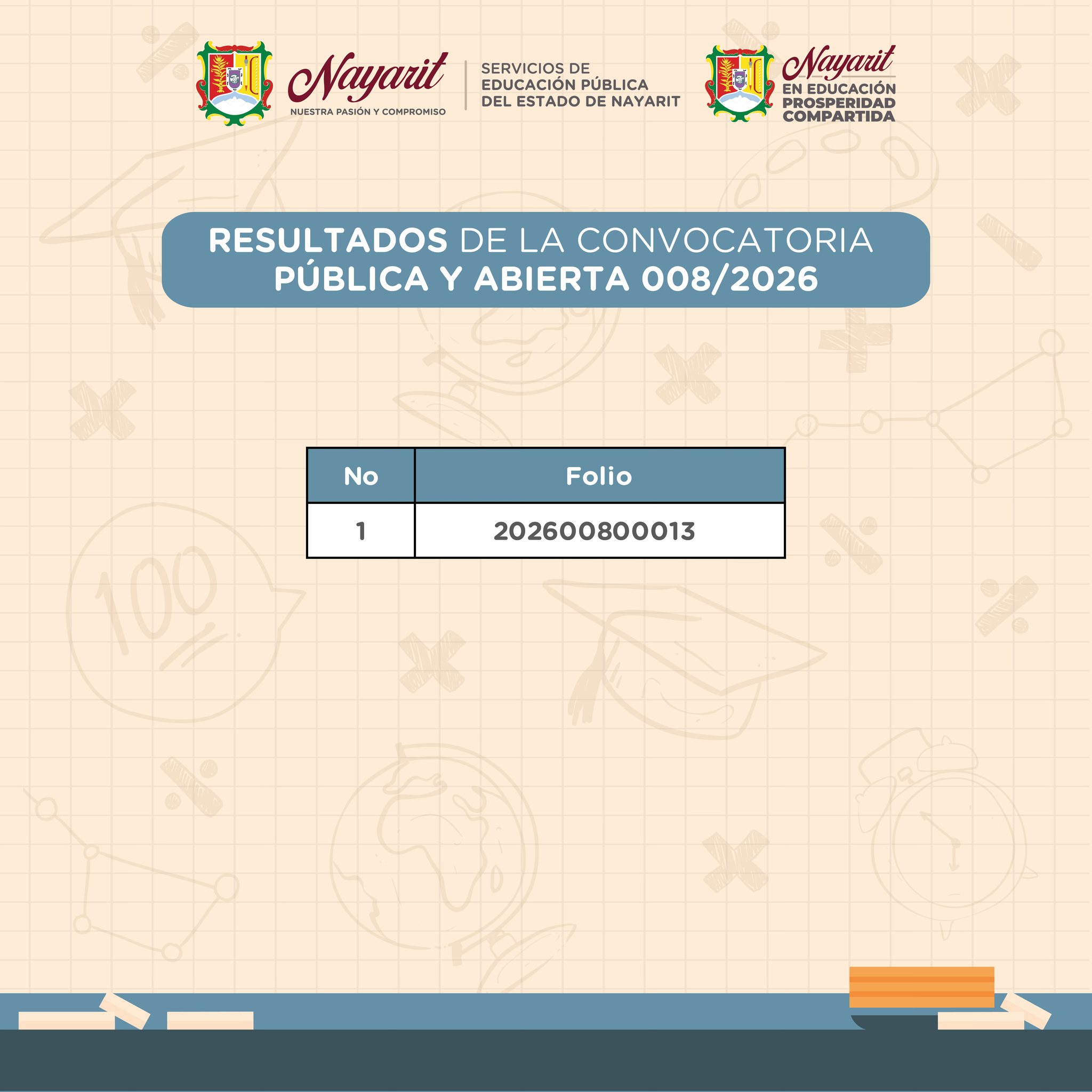 Los Servicios de Educación Pública del Estado de Nayarit, con fundamento en el Artículo 39 fracción XII de la Ley General del Sistema para la Carrera de las Maestras y los Maestros, hacen públicos los resultados de la Convocatoria Pública y Abierta 008/2026 para ocupar los puestos vacantes dentro de los centros de trabajo de Educación Primaria Indígena dependientes de éstos Servicios de Educación Pública del Estado de Nayarit.