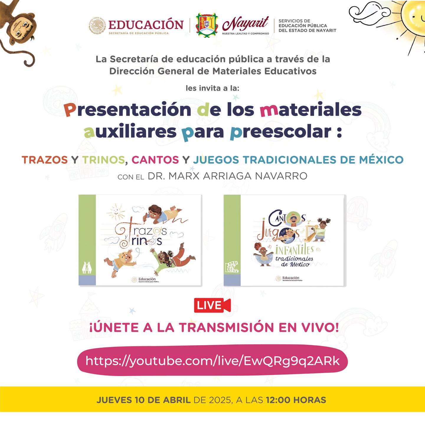 Te invitamos a seguir la transmisión en vivo de la Presentación de los materiales auxiliares para preescolar: Trazos y Trinos, Cantos y Juegos Tradicionales de México, con el Dr. Marx Arriaga Navarro.