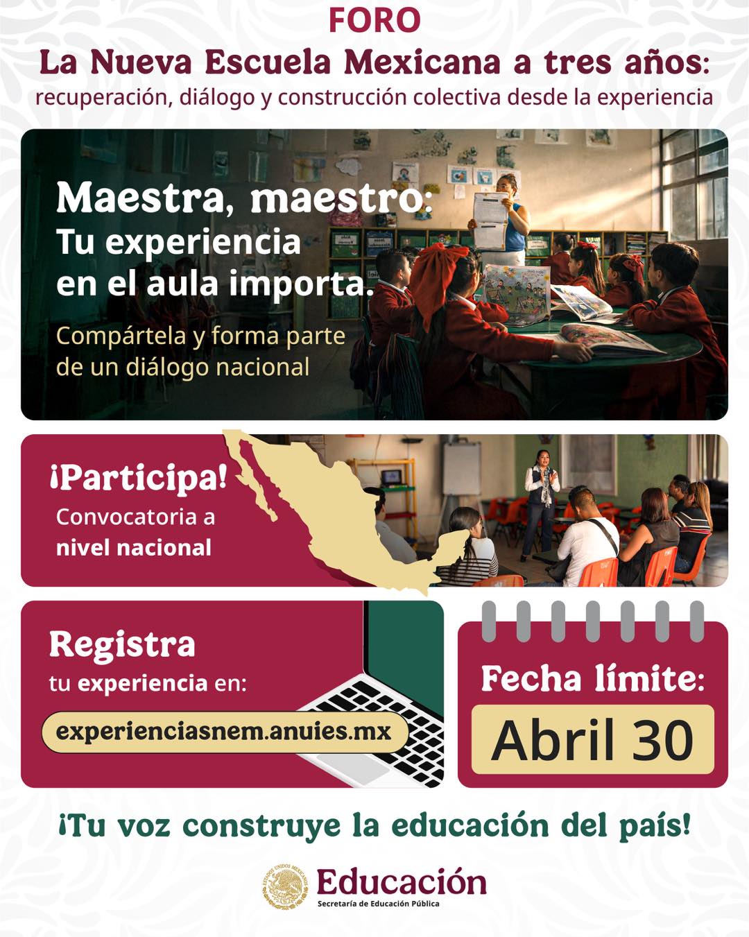 Maestra o maestro, comparte tu experiencia y forma parte del foro “La Nueva Escuela Mexicana a tres años: recuperación, diálogo y construcción colectiva desde la experiencia”.
