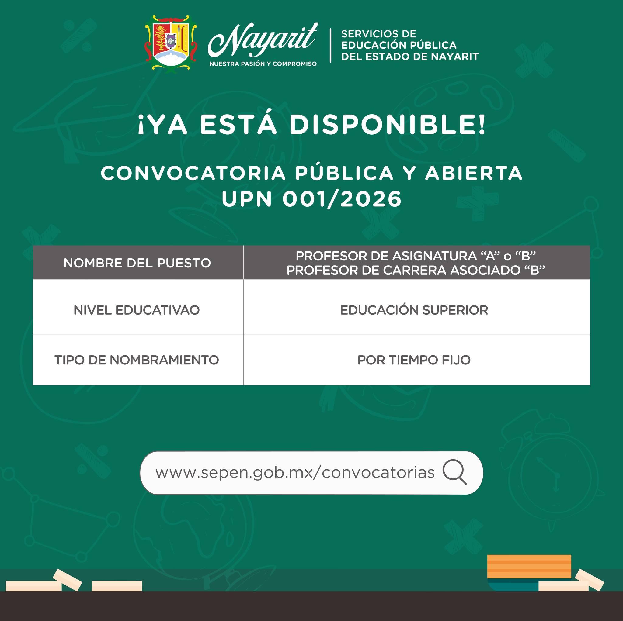 Los Servicios de Educación Pública del Estado de Nayarit, con fundamento en el artículo 16 fracción XII, XIII y XV, así como el artículo 49 fracción X y XI del Reglamento Interior de los Servicios de Educación Pública del Estado de Nayarit, emiten la siguiente Convocatoria Pública y Abierta UPN 001/2026 para ocupar los puestos vacantes dentro de la Universidad Pedagógica Nacional UPN Unidad 181.