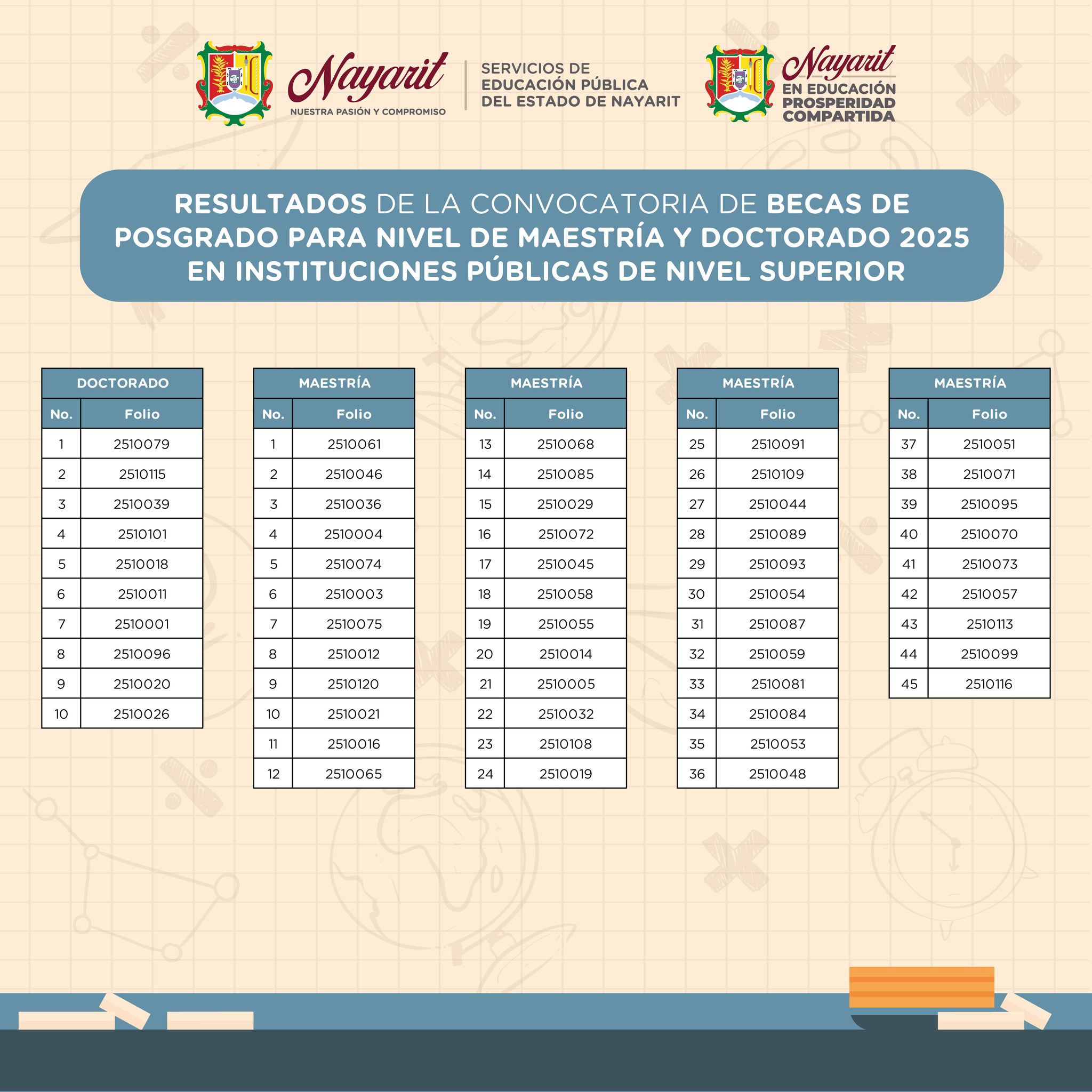 Con fundamento en el Artículo 3º de la Constitución Política de los Estados Unidos Mexicanos, los Lineamientos para el otorgamiento de Becas de Posgrado al Personal Docente de los Servicios de Educación Pública del Estado de Nayarit; hacen públicos los resultados de la convocatoria para el proceso de otorgamiento de Becas de Posgrado para nivel Maestría y Doctorado en Instituciones Públicas de Nivel Superior.