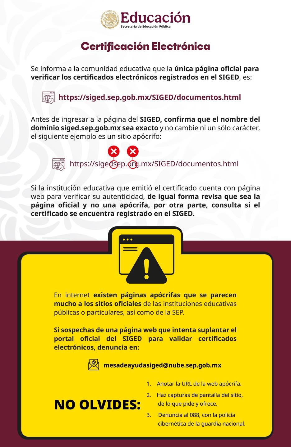 La Secretaría de Educación Pública informa que la única página oficial para verificar certificados electrónicos registrados en el SIGED es: https://siged.sep.gob.mx/SIGED/documentos.html