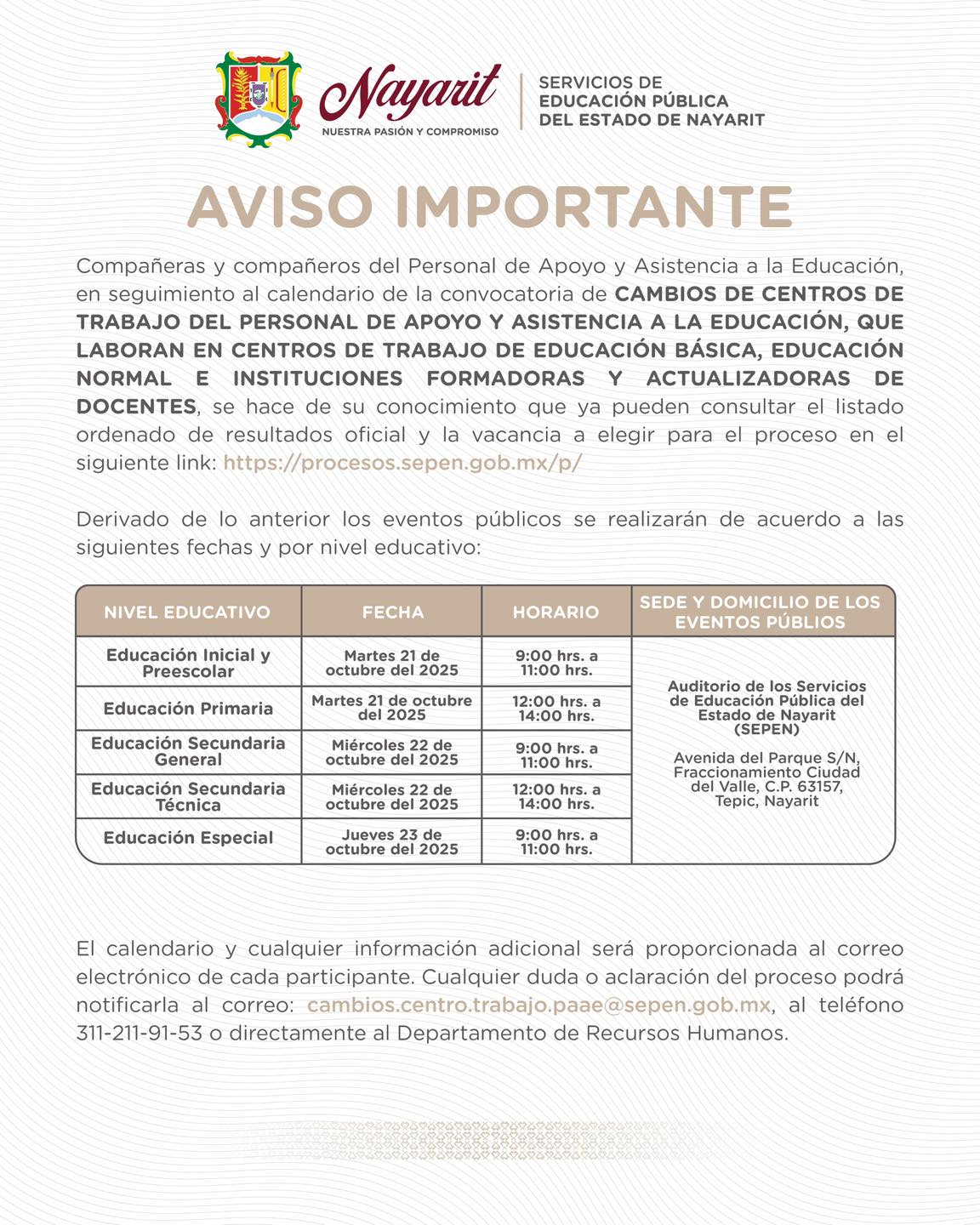 Los Servicios de Educación Pública del Estado de Nayarit informan al Personal de Apoyo y Asistencia a la Educación que ya se encuentra disponible el calendario de cambios de centros de trabajo en los diferentes niveles educativos.