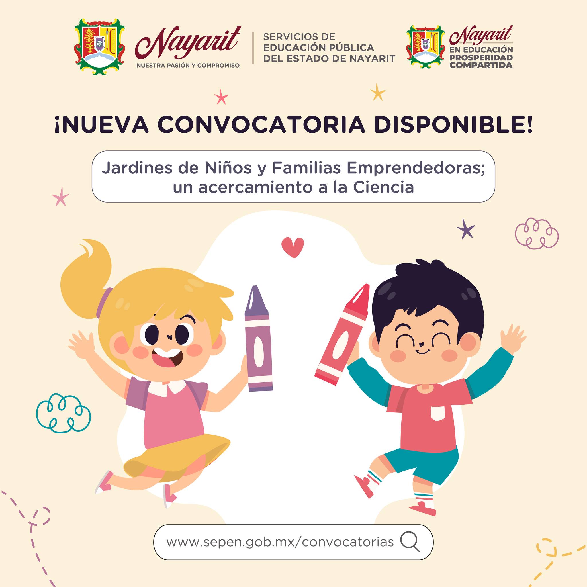 Con fundamento en el artículo 3 de la Constitución Política de los Estados Unidos Mexicanos, fracciones II con referencia al criterio que orienta a la educación en los resultados del progreso científico, inciso B en cuanto al aprovechamiento de nuestros recursos e independencia económica y fracción V que establece que toda persona tiene derecho a gozar de los beneficios del desarrollo de la ciencia y la innovación tecnológica, i) promover el máximo logro de aprendizajes de los educandos y el fortalecimiento de los lazos entre escuela y comunidad, así como en el artículo 34 fracción III y V del Reglamento Interior de los Servicios de Educación Pública del Estado de Nayarit; los Servicios de Educación Pública del Estado de Nayarit, La Dirección de Educación Básica a través del Departamento de Educación Inicial y Preescolar convocan al personal docente adscrito a Jardines de Niños pertenecientes a los Servicios de Educación Pública del Estado de Nayarit a participar en el proyecto: "Jardines de Niños y Familias Emprendedoras; un acercamiento a la Ciencia".