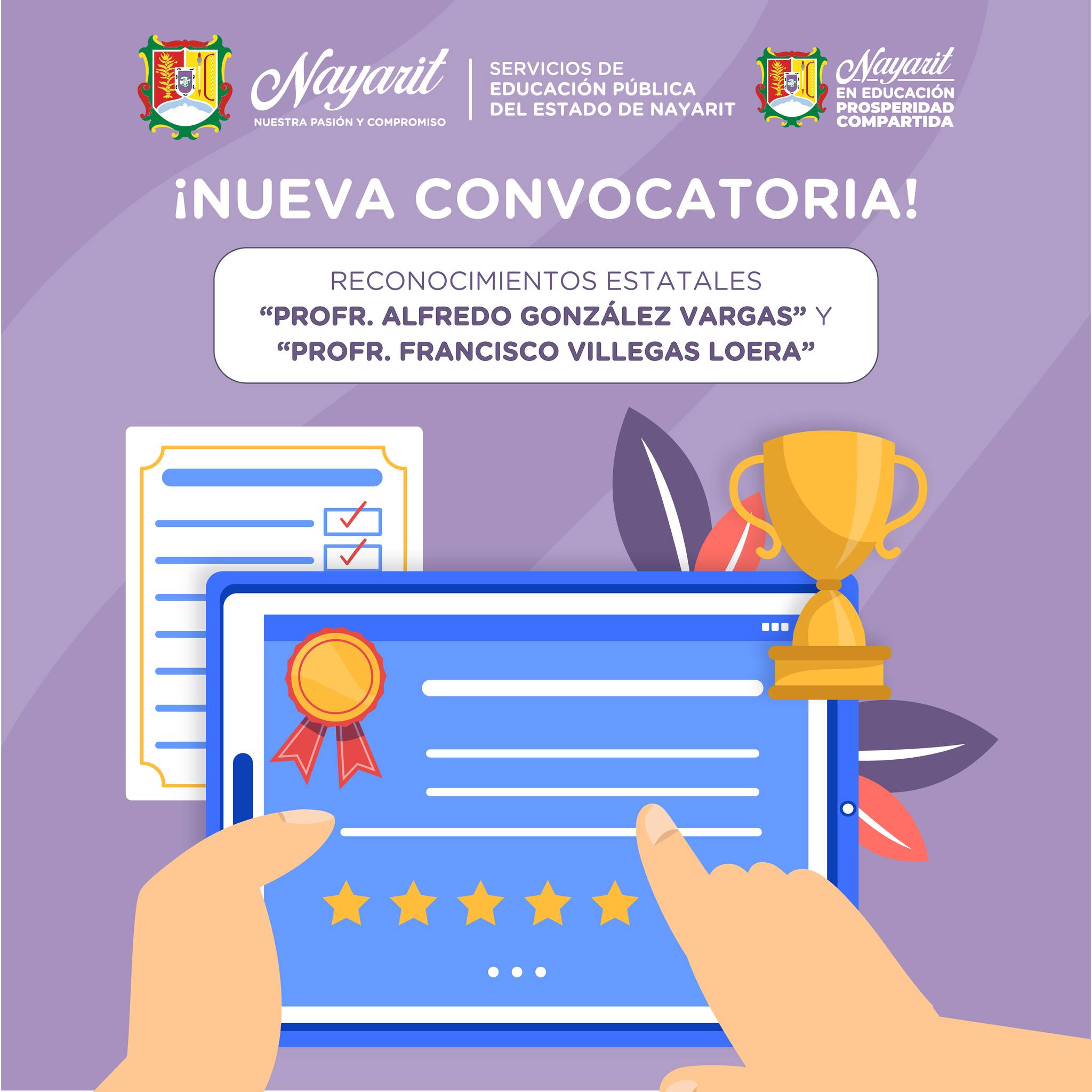 Con fundamento en el Decreto de fecha 24 de diciembre del año 2008, donde se crean los Reconocimientos Estatales por Antigüedad a los Trabajadores al Servicio Educativo Adscrito a los SEPEN, publicado en el Periódico Oficial Número 116, Tiraje 150. El Gobierno del Estado y los Servicios de Educación Pública del Estado de Nayarit, con el propósito de estimular y recompensar a las Maestras y Maestros que cumplan 30 y 50 años de servicio efectivos los Servicios de Educación Pública del Estado de Nayarit, a través de la Dirección de Servicios Administrativos convocan a todo el Personal Docente que cumpla con los requisitos para la obtención de reconocimientos estatales “PROFR. ALFREDO GONZÁLEZ VARGAS” Y “PROFR. FRANCISCO VILLEGAS LOERA” correspondientes al año de 2026.