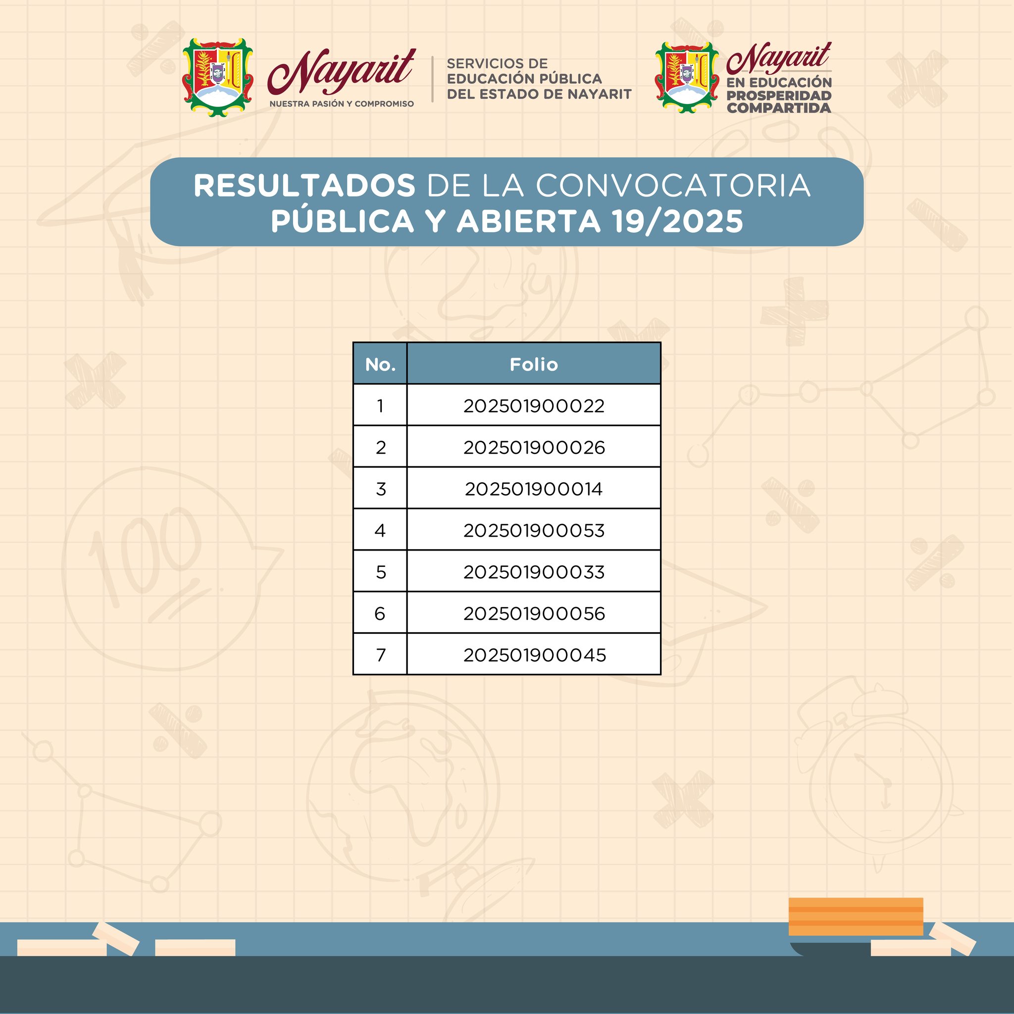 Los Servicios de Educación Pública del Estado de Nayarit, con fundamento en el Artículo 39 fracción XII de la Ley General del Sistema para la Carrera de las Maestras y los Maestros, hacen públicos los resultados de la Convocatoria Pública y Abierta 019/2025 para ocupar los puestos vacantes dentro de los centros de trabajo de Educación Indígena dependientes de estos Servicios de Educación Pública en el Estado de Nayarit.