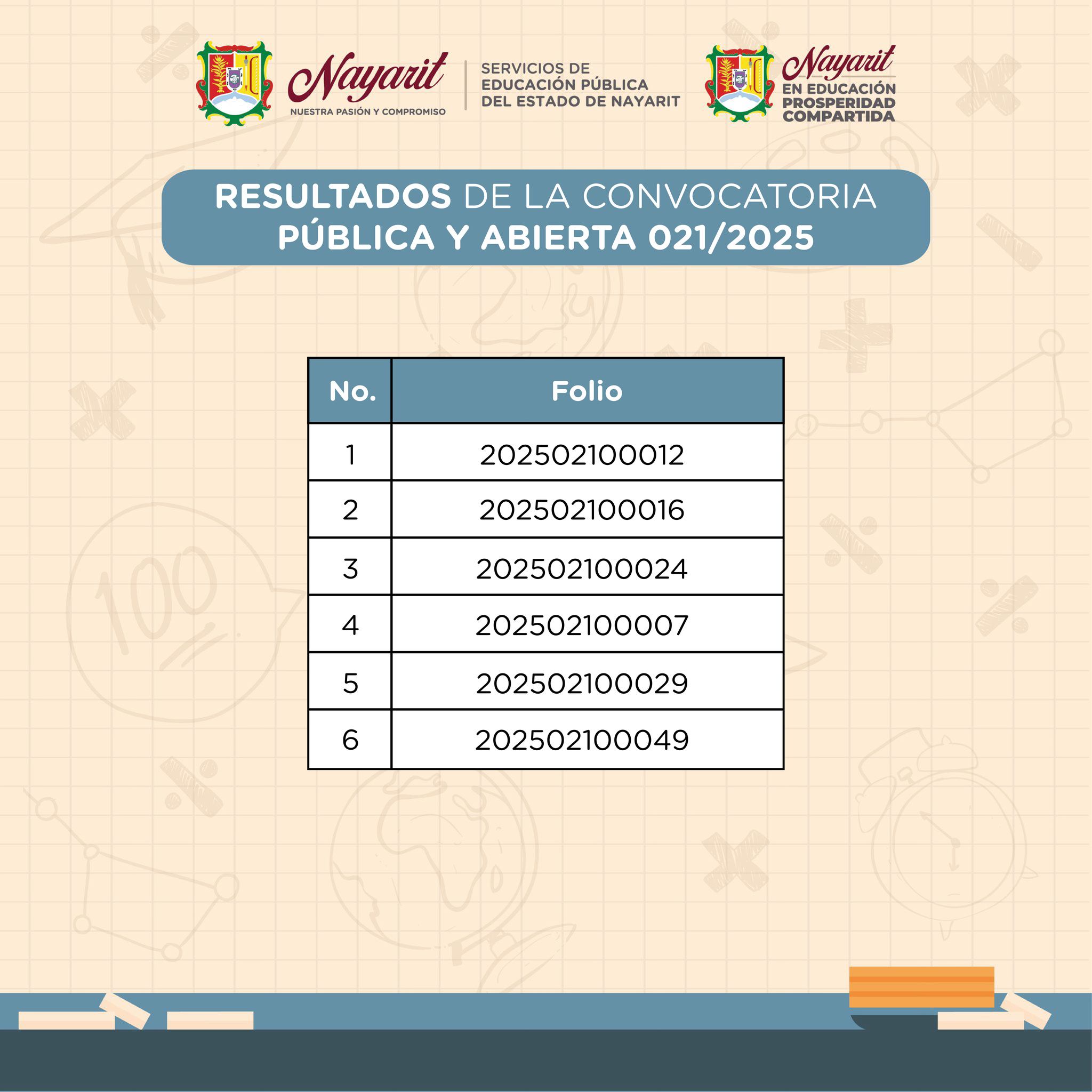 Los Servicios de Educación Pública del Estado de Nayarit, con fundamento en el Artículo 39 fracción XII de la Ley General del Sistema para la Carrera de las Maestras y los Maestros, hacen públicos los resultados de la Convocatoria Pública y Abierta 021/2025 para ocupar los puestos vacantes dentro de los centros de trabajo de Educación Indígena dependientes de estos Servicios de Educación Pública en el Estado de Nayarit.