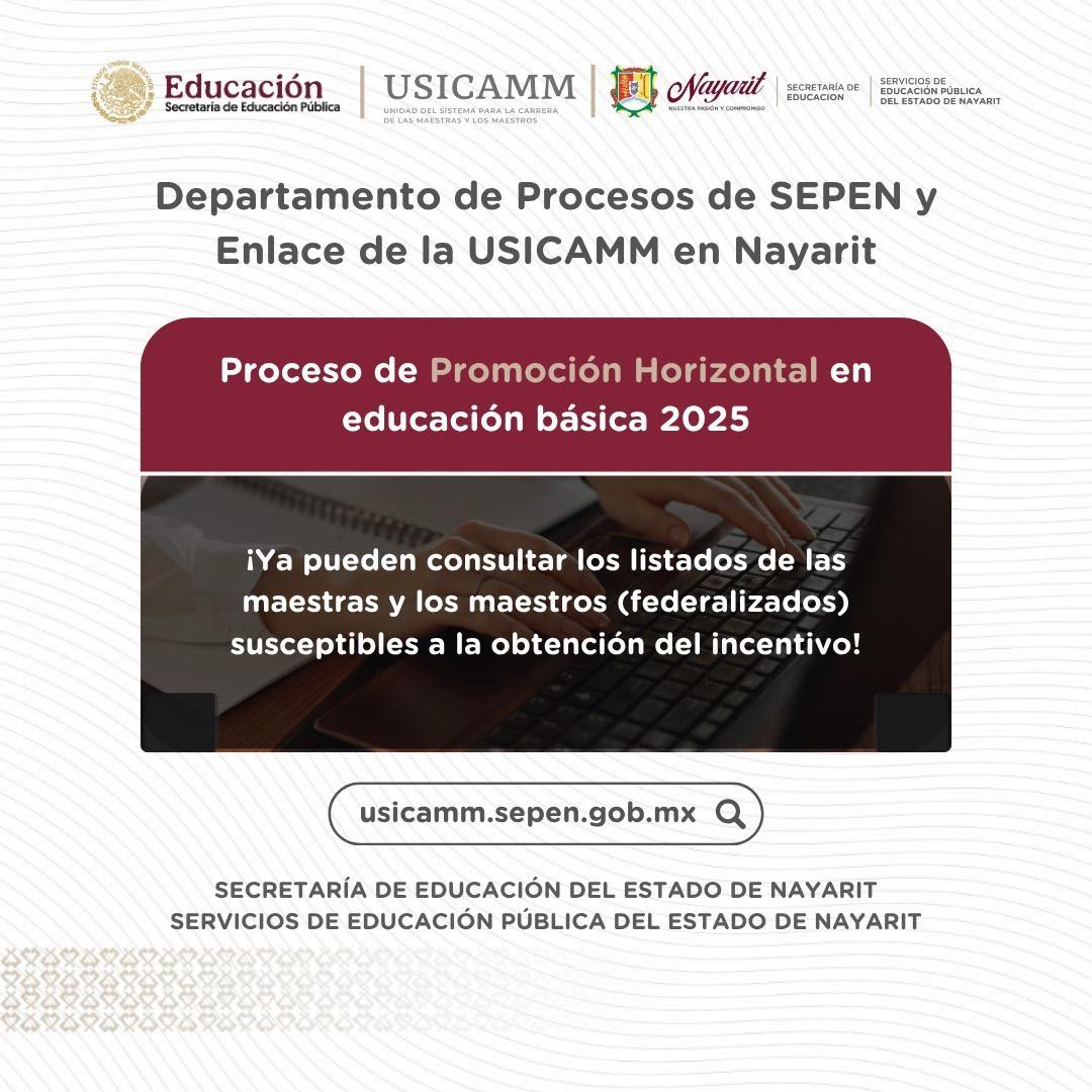 En el marco del Programa de Promoción Horizontal por niveles con incentivos en Educación Básica 2025 y, con base en los Artículos 41 y 42, Fracción IV del Acuerdo que contiene las reglas del Programa; se publica el listado de las maestras y los maestros del sostenimiento federal susceptibles a la incorporación del Nivel 1. La información es pública y pueden acceder a ella a través de nuestra página oficial: https://usicamm.sepen.gob.mx/