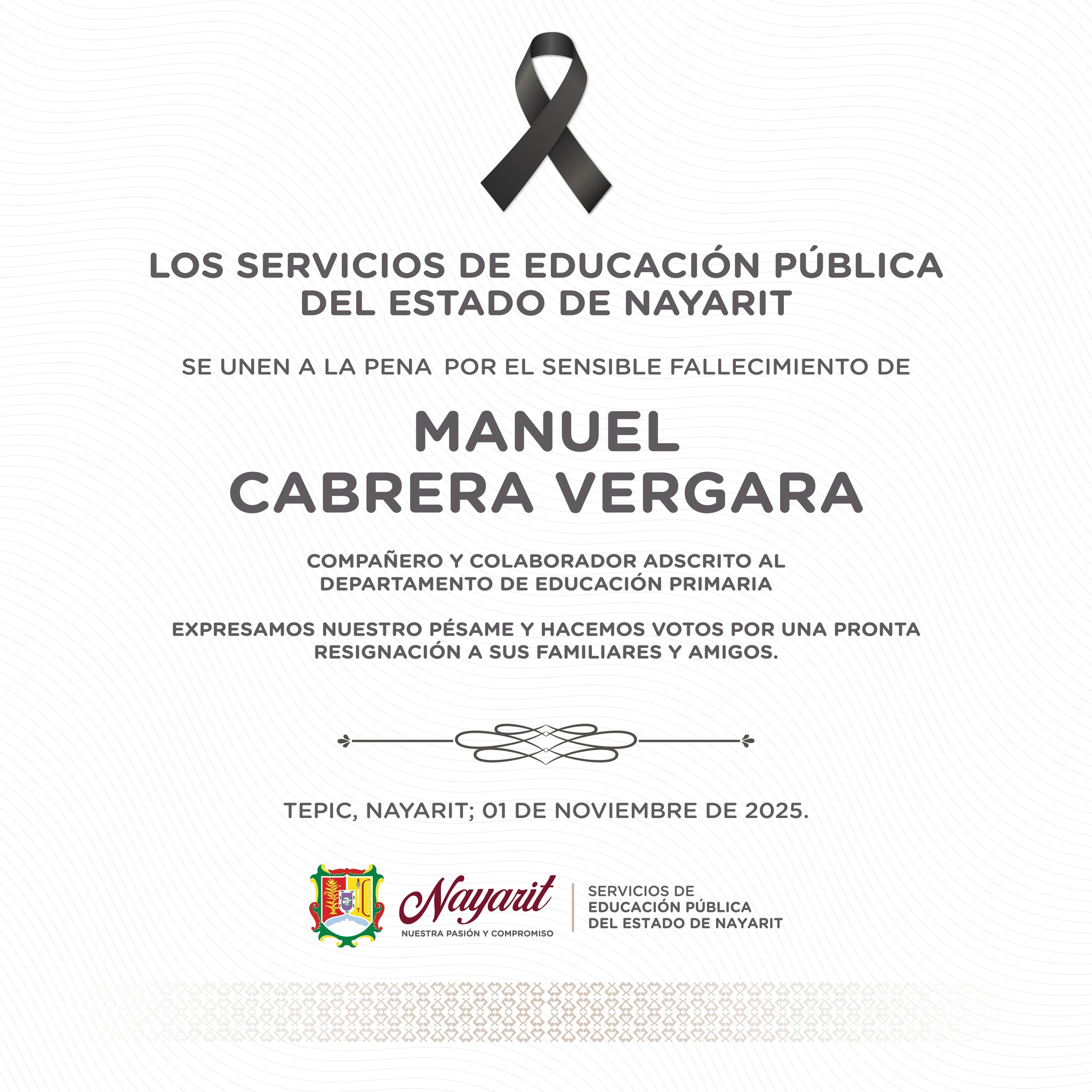 Los Servicios de Educación Pública del Estado de Nayarit expresan sus más sinceras condolencias por el sensible fallecimiento del compañero Manuel Cabrera Vergara.