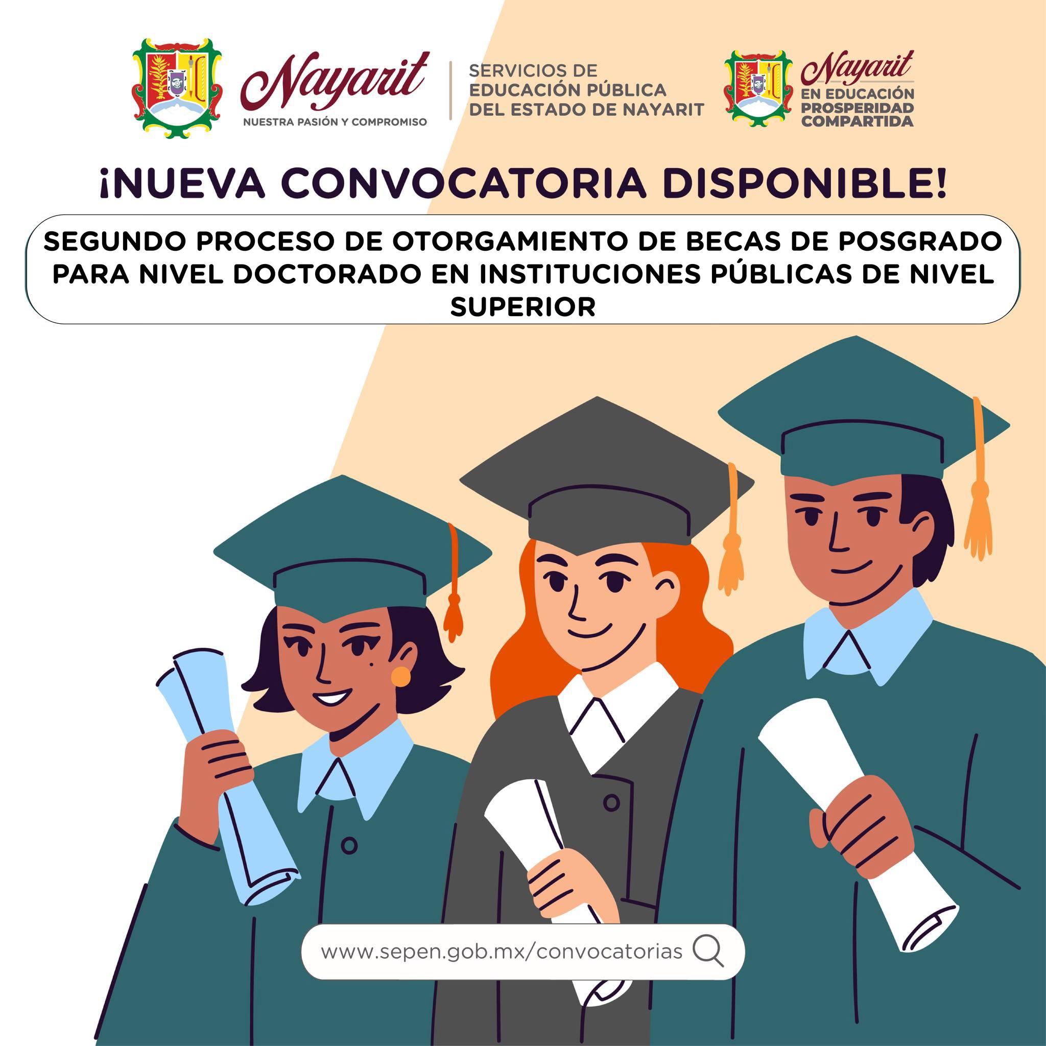 Con fundamento en el Artículo 3º de la Constitución Política de los Estados Unidos Mexicanos, los Lineamientos para el otorgamiento de Becas de Posgrado al Personal Docente de los Servicios de Educación Pública del Estado de Nayarit; convoca al personal docente frente a grupo de Educación Básica, adscrito a los Servicios de Educación Pública del Estado de Nayarit, a participar en el segundo proceso de otorgamiento de Becas de Posgrado para nivel Doctorado en Instituciones Públicas de Nivel Superior.