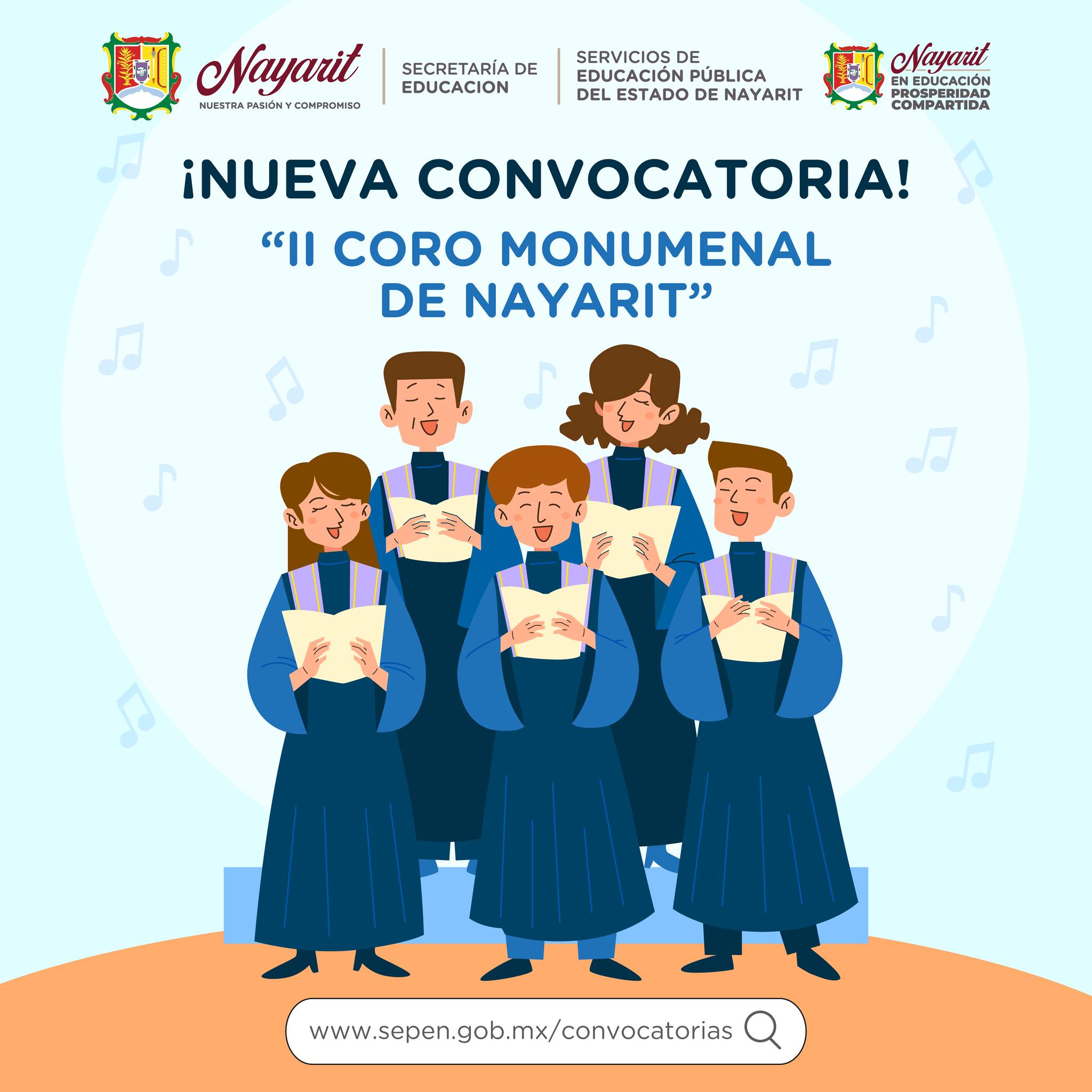 Con fundamento en los artículos 46 y 54 de la Ley sobre el Escudo, la Bandera y el Himno Nacionales y artículo 41 fracción V, VI y VII del Reglamento Interior de los Servicios de Educación Pública del Estado de Nayarit, y con la finalidad de contribuir en el perfil de egreso de los alumnos, mediante el Arte y Experiencias Estéticas, como eje articulador de la NEM y el campo formativo del Lenguaje insertos en el Plan de Estudios 2022, la Secretaría de Educación y los Servicios de Educación Pública del Estado de Nayarit convocan a las Escuelas Primarias Y Secundarias oficiales públicas y privadas pertenecientes a la Secretaría de Educación y a los Servicios de Educación Pública del Estado de Nayarit, a participar en el II Coro Monumental de Nayarit.