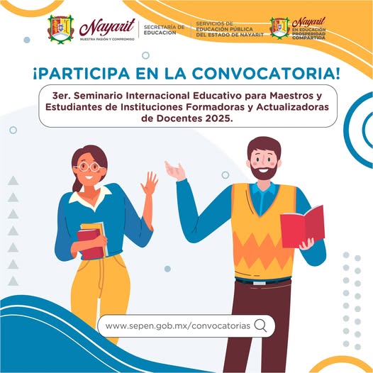 Con fundamento en el artículo 3 de la Constitución Política de los Estados Unidos Mexicanos, 49 del Reglamento Interno de los Servicios de Educación Pública del Estado de Nayarit, con la finalidad de promover un enfoque de enseñanza-aprendizaje basado en la investigación, donde los futuros maestros y los formadores de docentes, se apropien de metodologías para indagar, analizar y construir conocimiento de manera autónoma y colaborativa, que impactan directamente en la calidad educativa y el desarrollo integral de los estudiantes y maestros, la Secretaría de Educación (SE) del Estado de Nayarit, los Servicios de Educación Pública del Estado de Nayarit (SEPEN), a través del Departamento de Instituciones Formadoras y Actualizadoras de Docentes (DIFAD) y del Departamento de Educación Normal y Formación Docente (DENFD) convocan al personal Académico y a Estudiantes de las Instituciones Formadoras y Actualizadoras de Docentes, a Investigadores de Instituciones de Educación Superior (IES) del Estado de Nayarit; interesados en presentar ponencias o talleres en el 3er. Seminario Internacional Educativo para Maestros y Estudiantes de Instituciones Formadoras y Actualizadoras de Docentes 2025.
