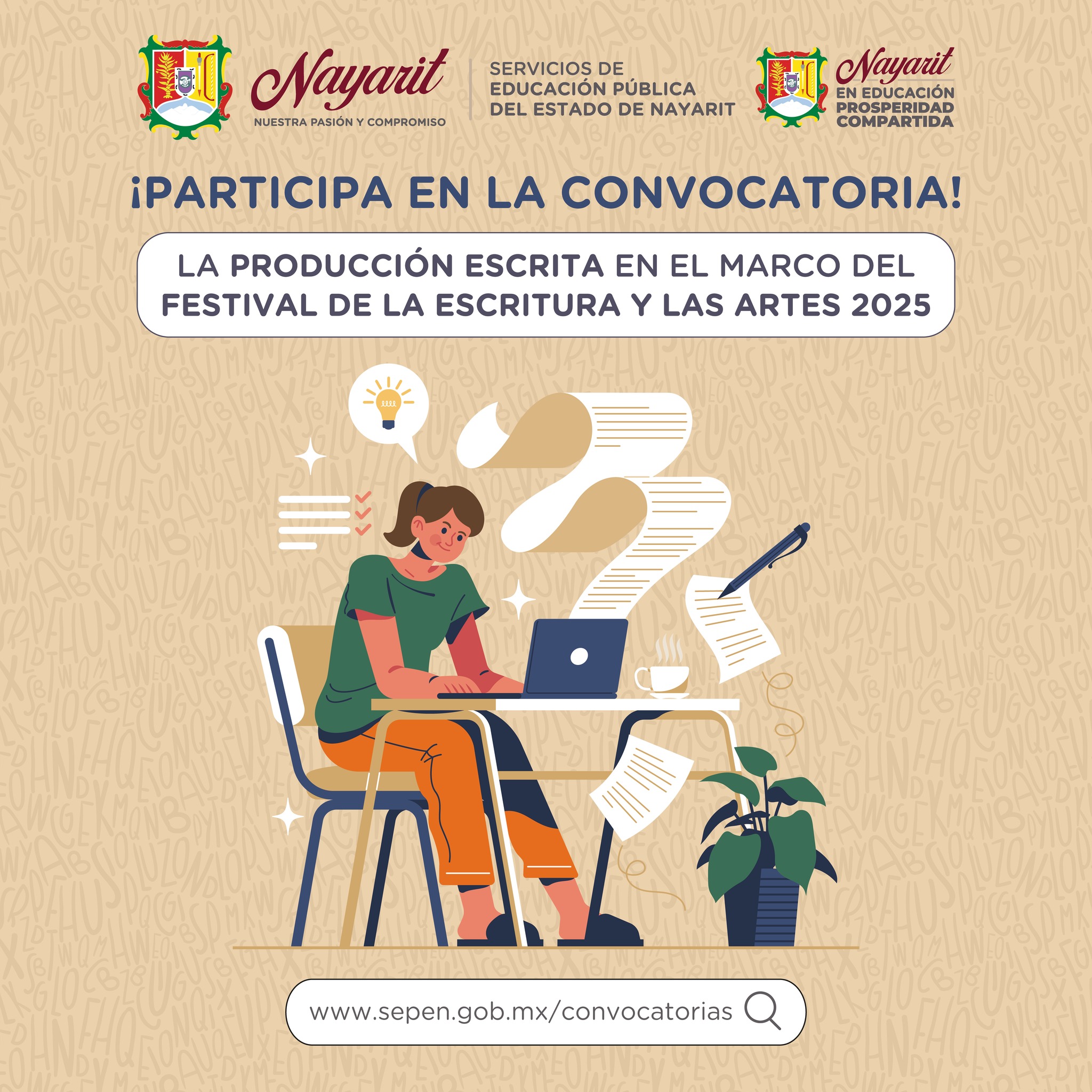 Con fundamento en el artículo 3 de la Constitución Política de los Estados Unidos Mexicanos, 41 fracciones V, VI, VII, VIII y IX del Reglamento Interior de los Servicios de Educación Pública del Estado de Nayarit, y en apego a las atribuciones conferidas a la Dirección de Educación Básica para coordinar acciones que fortalezcan los procesos pedagógicos, formativos y culturales; con el propósito de promover la producción escrita como una práctica educativa significativa que impulse el desarrollo de las competencias comunicativas, expresivas y creativas del alumnado de educación básica, contribuyendo al fortalecimiento del pensamiento crítico, la sensibilidad artística y la construcción de una cultura de paz, inclusión y convivencia escolar, reafirmando el compromiso institucional de los SEPEN con una educación integral que reconoce la voz, la imaginación y la identidad cultural de niñas, niños y adolescentes nayaritas; los Servicios de Educación pública del Estado de Nayarit, a través la Dirección de Educación Básica convocan a alumnas y alumnos de los niveles y modalidades correspondientes a la Educación Básica: Preescolar, Primaria y Secundaria de escuelas pertenecientes a los Servicios de Educación Pública del Estado de Nayarit, a participar en "La Producción Escrita en el Marco del Festival de la Escritura y las Artes 2025”.