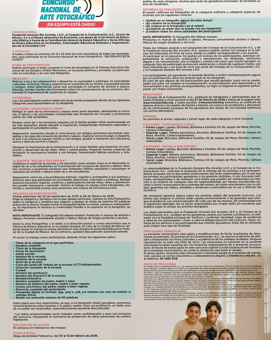Invitamos a las y los estudiantes de nivel secundaria, de 12 a 15 años, a participar en el Concurso Nacional de Arte Fotográfico “¡En equipo está chido!”. A través de una fotografía y un breve relato, podrán expresar su visión, talento e ideas, utilizando celular, cámara o computadora.